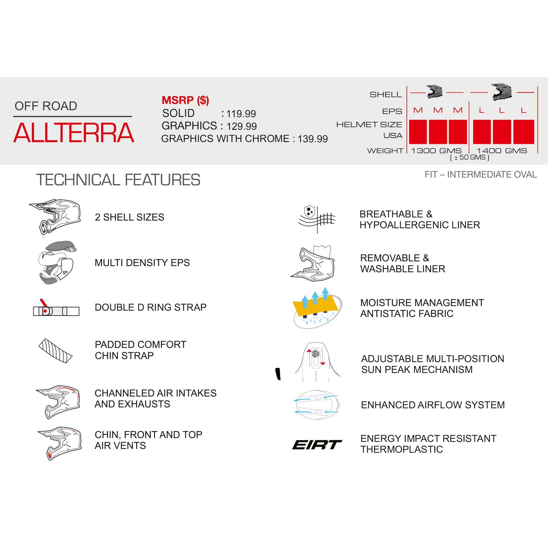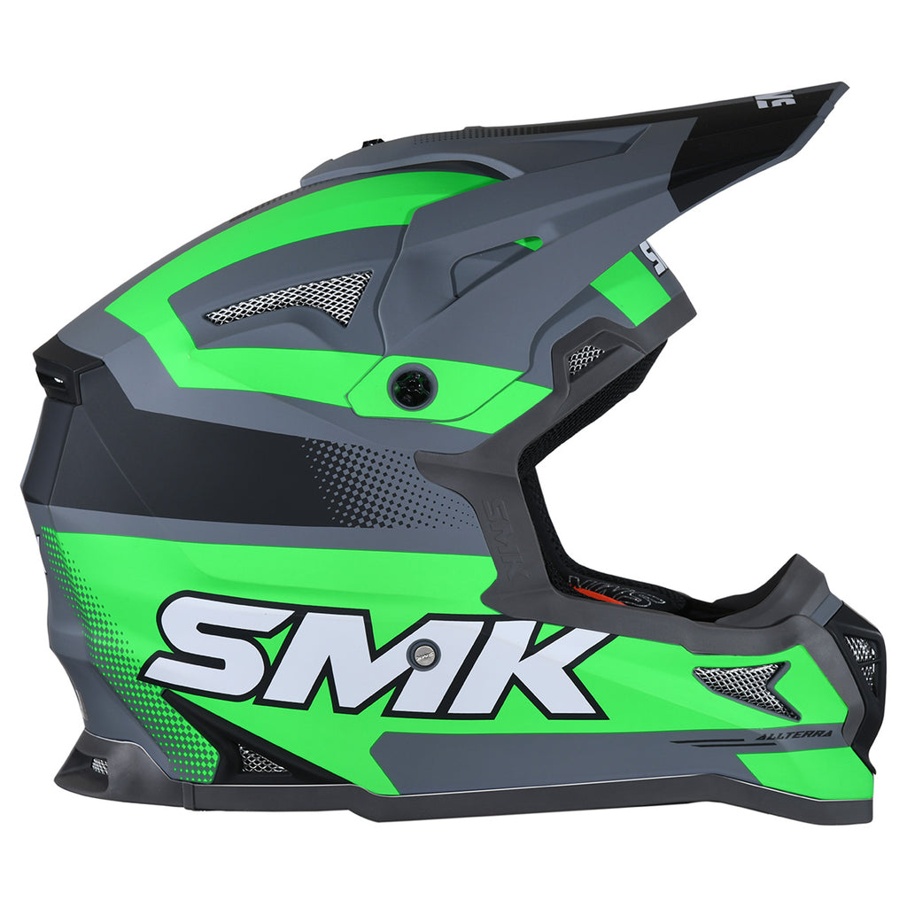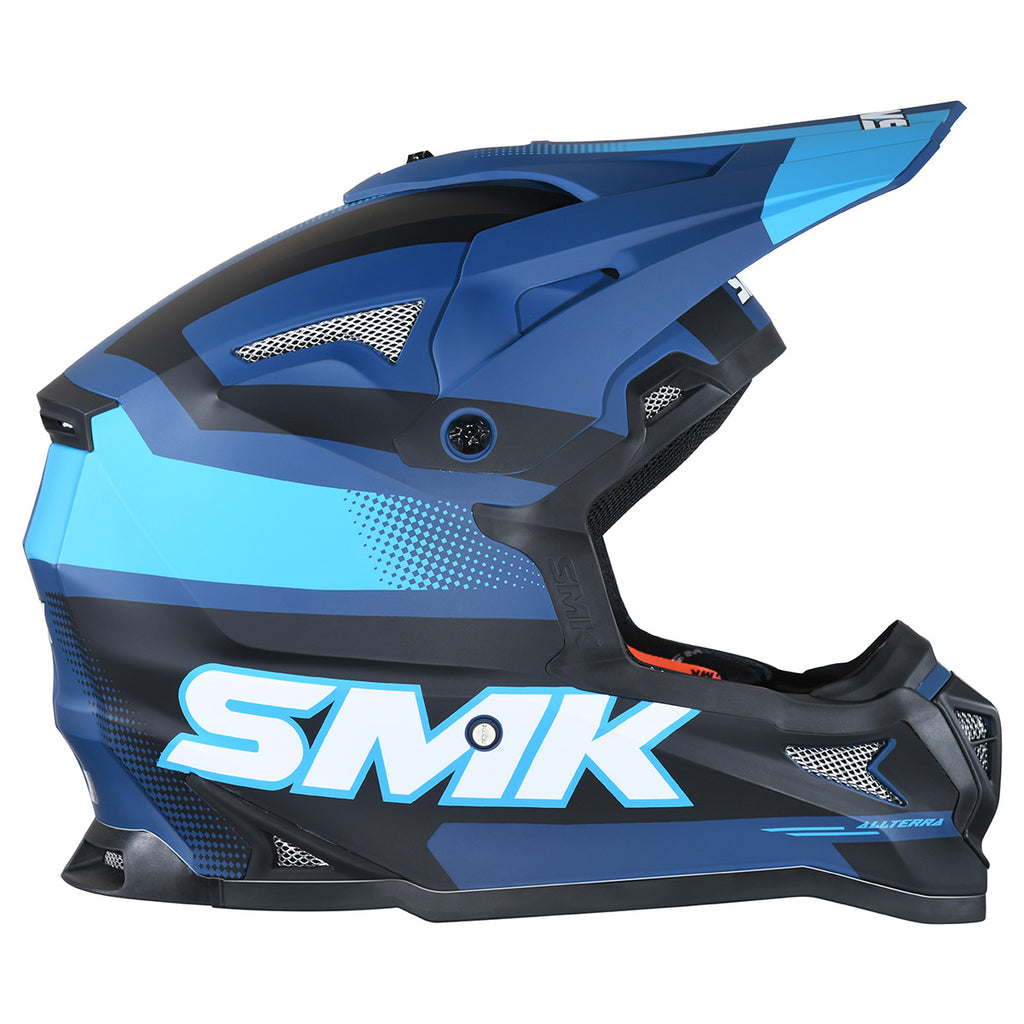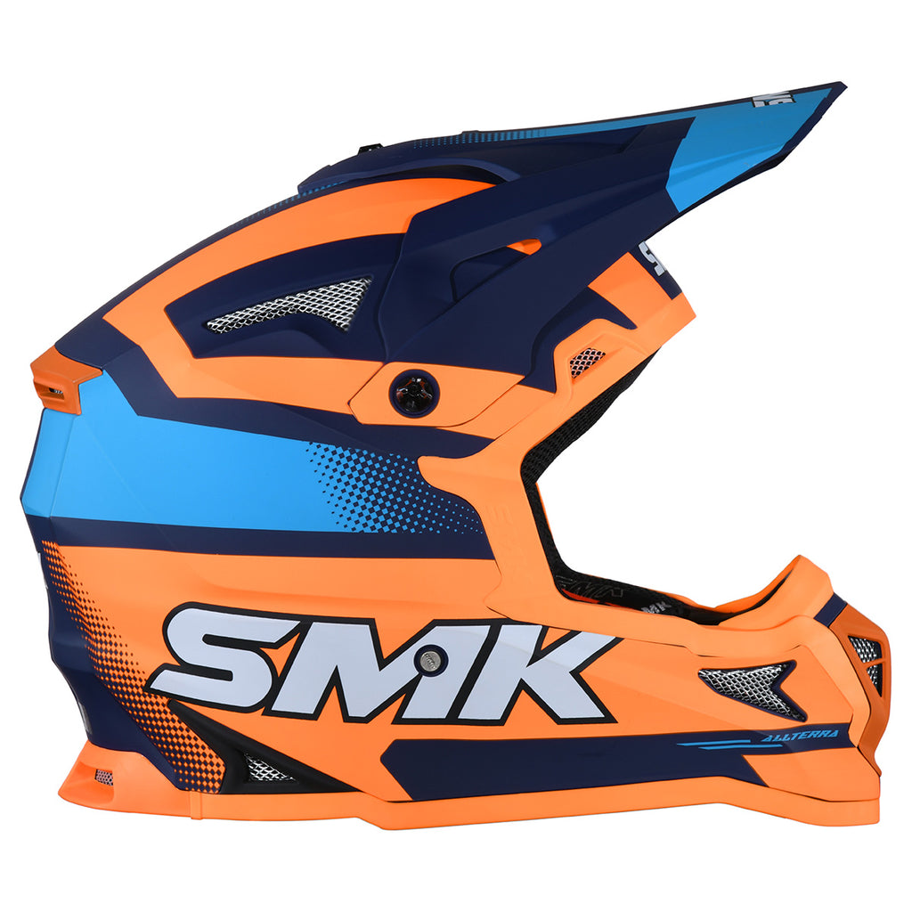 The Allterra Off-Road Helmet is designed for off-road enthusiasts and MX riders. Its lightweight injected EIRT shell provides strength and protection, while the easily adjustable or removable sun peak and extra-wide eye opening accommodate MX goggles for an optimal view. Multiple vents, channeled exhausts, and chin air vents maximize airflow. The helmet features a removable, washable liner for comfort and an intermediate oval fit. Dual-certified DOT and ECE 22.06, it is available in sizes XS to 2XL.