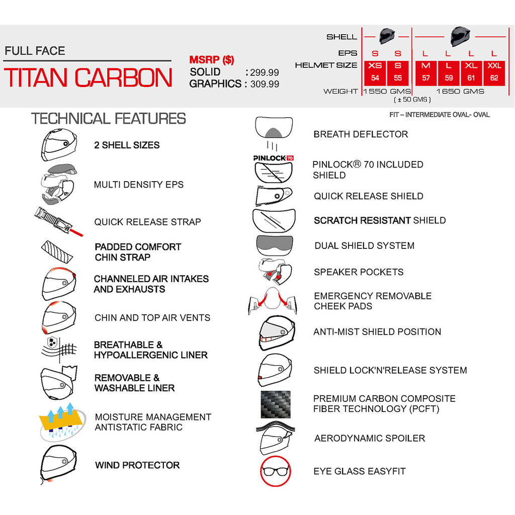 The SMK Titan Carbon Helmet is crafted with premium composite carbon fiber technology (P2CFT) for lightweight strength and protection. It includes a smoke drop-down sunshield, a clear shatter-resistant outer shield, and a Pinlock 70 no-fog insert. The advanced ventilation system and breath deflector provide comfort on long rides, while the liner is removable for easy cleaning and includes channels to accommodate glasses. Emergency removable cheek pads add extra safety. Riders can customize their look with multiple Pinlock 70 ready outer shields, including Smoke, Silver Mirror, Light Blue Mirror, Dark Blue Mirror, Gold Mirror, and Rainbow Mirror. Dual-certified to DOT and ECE 22.06 safety standards, available in an intermediate oval fit.