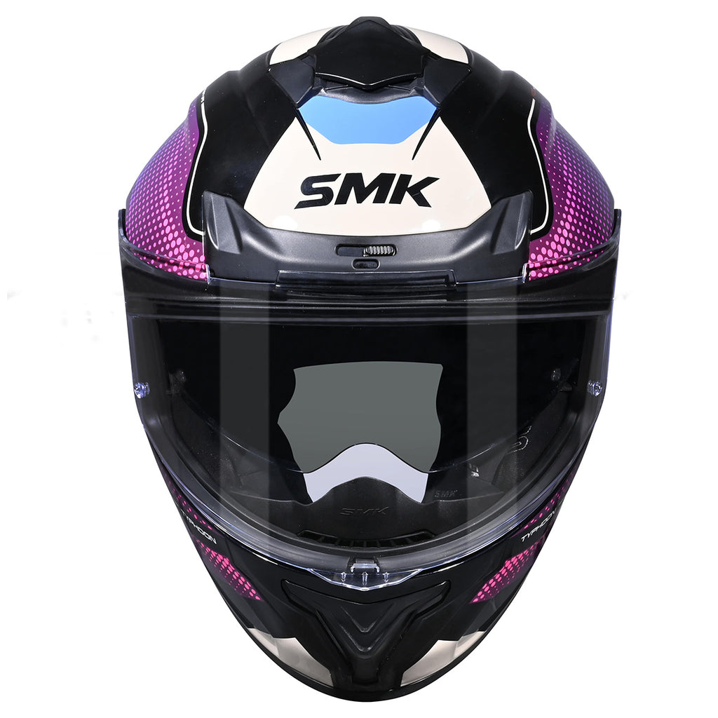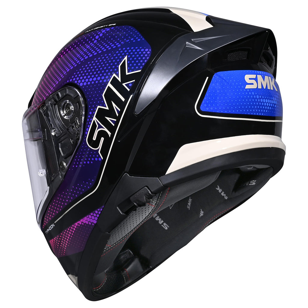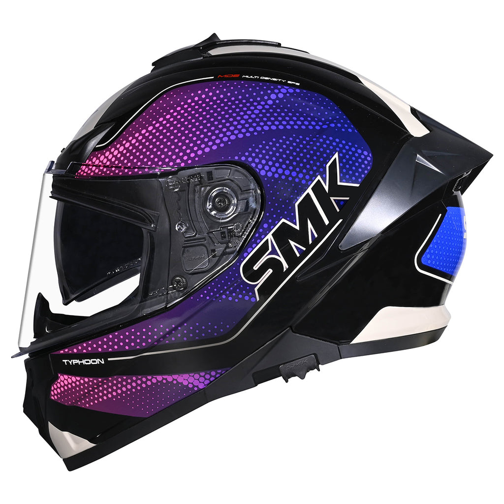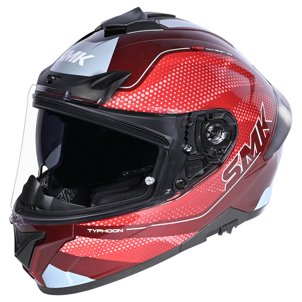 The SMK Typhoon Helmet features a compact, aerodynamic shell with front and chin vents for strong airflow. It comes with a drop-down smoke sunshield, a clear scratch-resistant outer shield that is Pinlock® 70 ready, and includes multiple outer shield options for customization. A removable liner allows for easy cleaning, while a breath deflector, wind protector, and channeled exhausts add to rider comfort. Built with a multi-density EPS and quick-release strap system, the Typhoon is dual-certified to DOT and ECE 22.06 safety standards. Available in an intermediate oval fit.