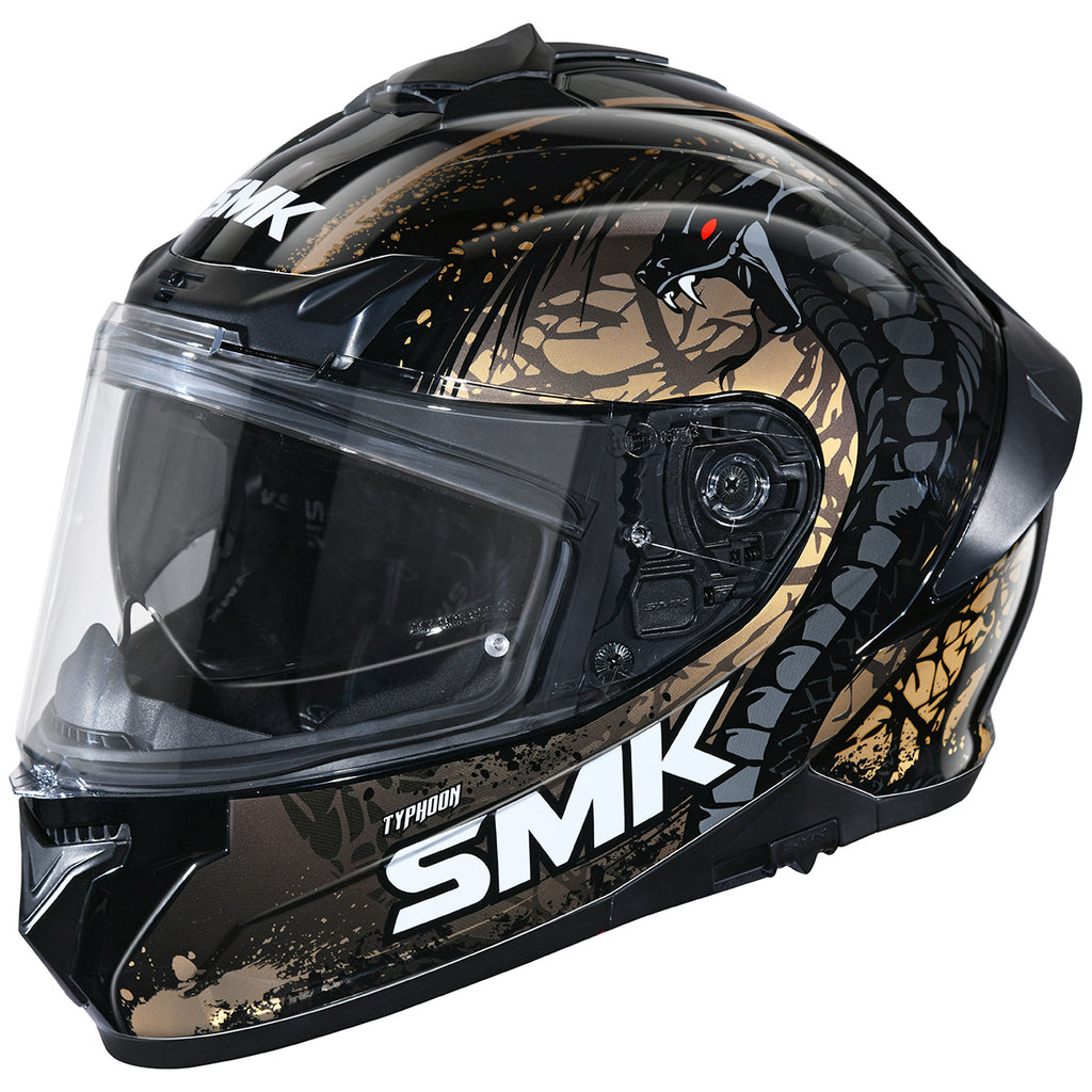 The SMK Typhoon Helmet features a compact, aerodynamic shell with front and chin vents for strong airflow. It comes with a drop-down smoke sunshield, a clear scratch-resistant outer shield that is Pinlock® 70 ready, and includes multiple outer shield options for customization. A removable liner allows for easy cleaning, while a breath deflector, wind protector, and channeled exhausts add to rider comfort. Built with a multi-density EPS and quick-release strap system, the Typhoon is dual-certified to DOT and ECE 22.06 safety standards. Available in an intermediate oval fit.
