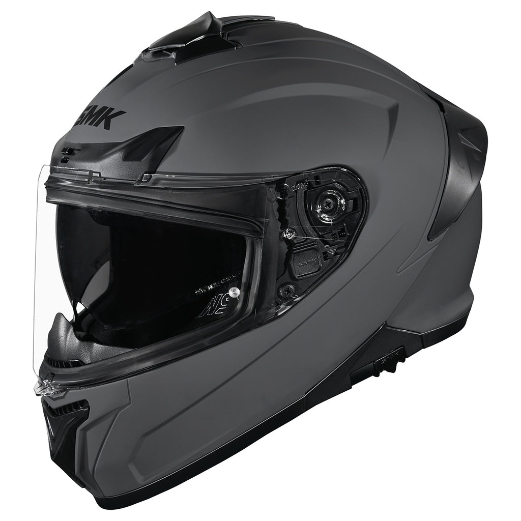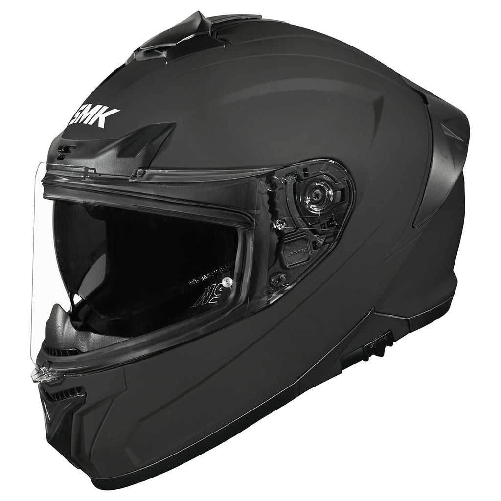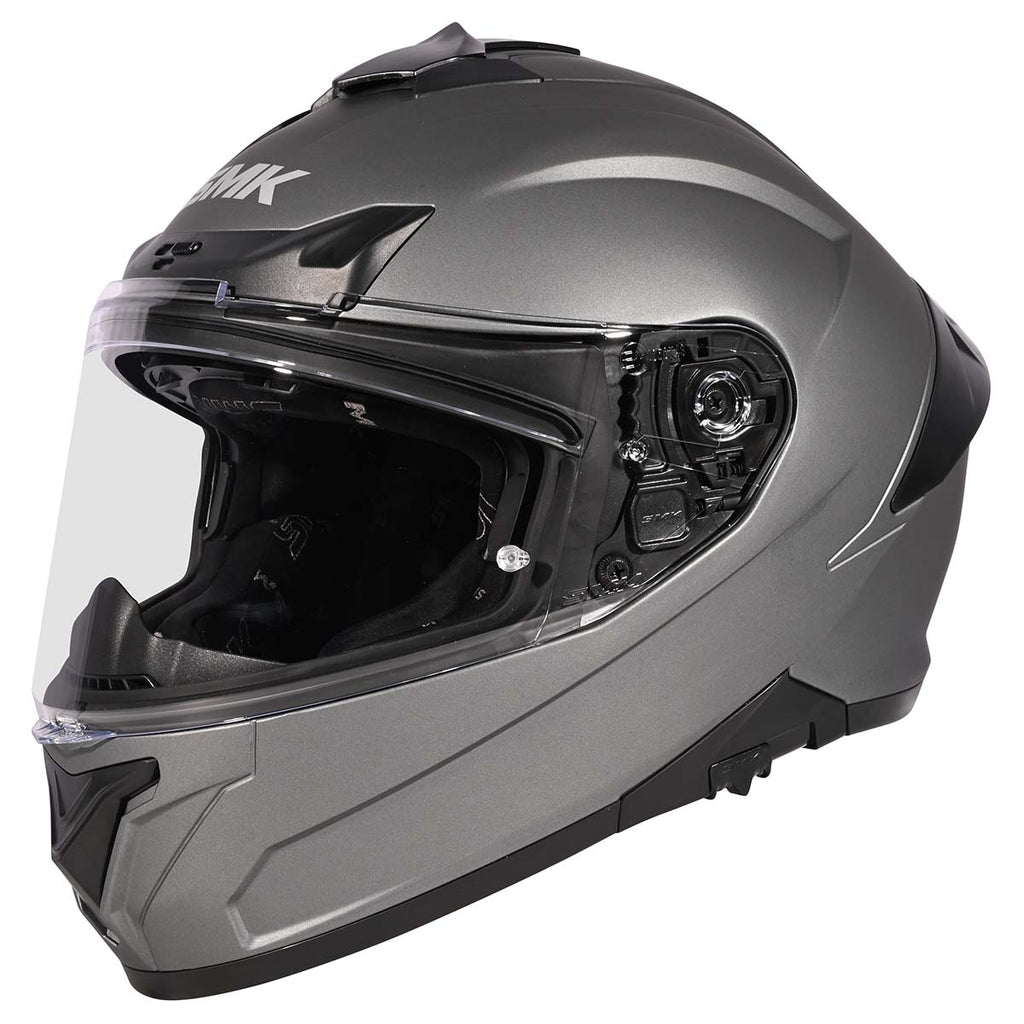 The SMK Typhoon Helmet features a compact, aerodynamic shell with front and chin vents for strong airflow. It comes with a drop-down smoke sunshield, a clear scratch-resistant outer shield that is Pinlock® 70 ready, and includes multiple outer shield options for customization. A removable liner allows for easy cleaning, while a breath deflector, wind protector, and channeled exhausts add to rider comfort. Built with a multi-density EPS and quick-release strap system, the Typhoon is dual-certified to DOT and ECE 22.06 safety standards. Available in an intermediate oval fit.