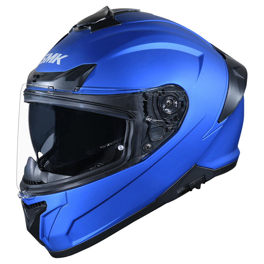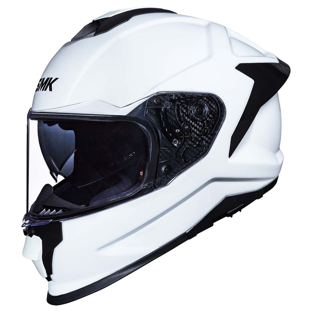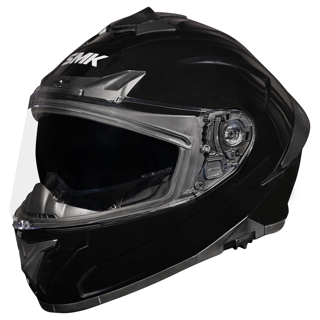 The SMK Typhoon Helmet features a compact, aerodynamic shell with front and chin vents for strong airflow. It comes with a drop-down smoke sunshield, a clear scratch-resistant outer shield that is Pinlock® 70 ready, and includes multiple outer shield options for customization. A removable liner allows for easy cleaning, while a breath deflector, wind protector, and channeled exhausts add to rider comfort. Built with a multi-density EPS and quick-release strap system, the Typhoon is dual-certified to DOT and ECE 22.06 safety standards. Available in an intermediate oval fit.
